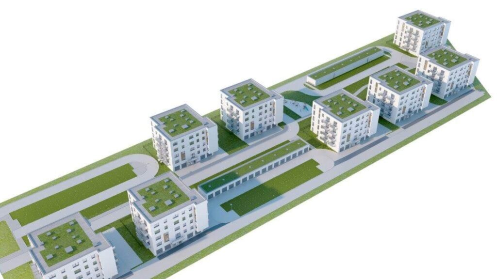 Budynki o jasnej elewacji i regularnej bryle, pasujące do nowoczesnego charakteru rozwijającej się okolicy.